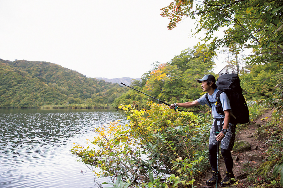2日目は視界がクリアになり、大鳥池の全貌も見えてきた。僕はトレッキングポールを釣り竿に見立てて、ひと振り。かつての釣り少年なら、みんなこうしてしまうはず。