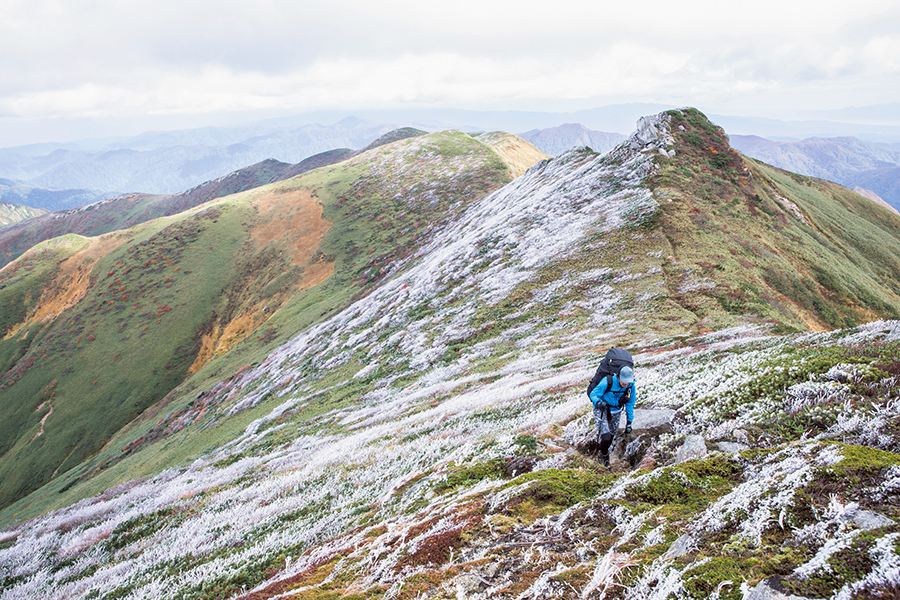 この稜線で僕が心奪われたのは、じつは紅葉よりも霧氷。以東岳に近づくにつれて、葉の落ちた小枝やハイマツの細かな葉にはびっしりと氷が張り付いていたのだ。不思議なことに、その氷はどことなく紫がかったように見え、山ではあまり見られないような色合い。