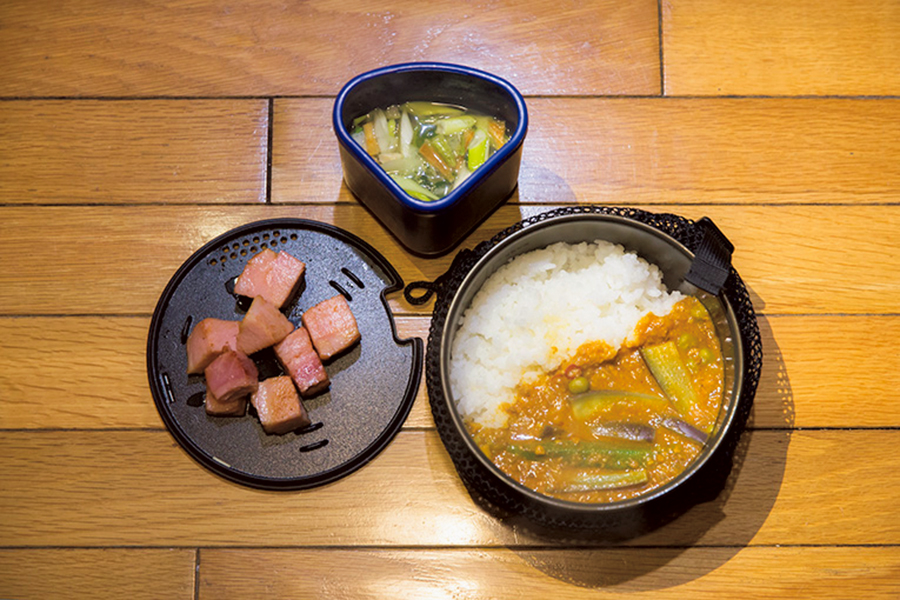 野菜入りのキーマカレーにネギスープ、そして軽く炒めたベーコンというちょっと豪華な夕食。
