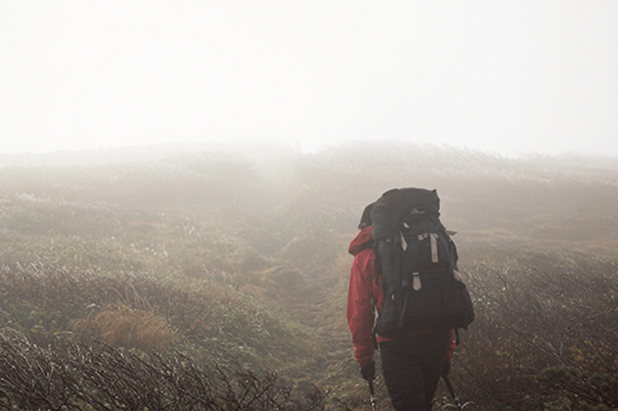 ガスの濃度はかなりキツく、前方の視界はきかない。僕は以前、朝日連峰に匹敵する大縦走路をもつ東北の雄、飯豊連峰をひとりで歩いているときに、このようなホワイトアウトで道に迷ったことを思い出し、嫌な気持ちでいっぱいになる。