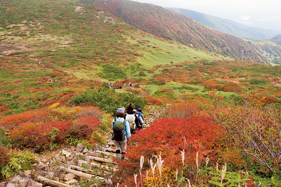 見どころは荒涼とした茶臼岳や噴煙たなびく荒々しい周辺の火山風景ですが、ハイマツやミヤマナラといった常緑低木林の隙間を縫うように青々とした笹原が山肌に広がり、紅葉の時期となるとそこに色鮮やかなナナカマドやドウダン、ウルシなどが紅葉を描き出す風景も魅力となります。