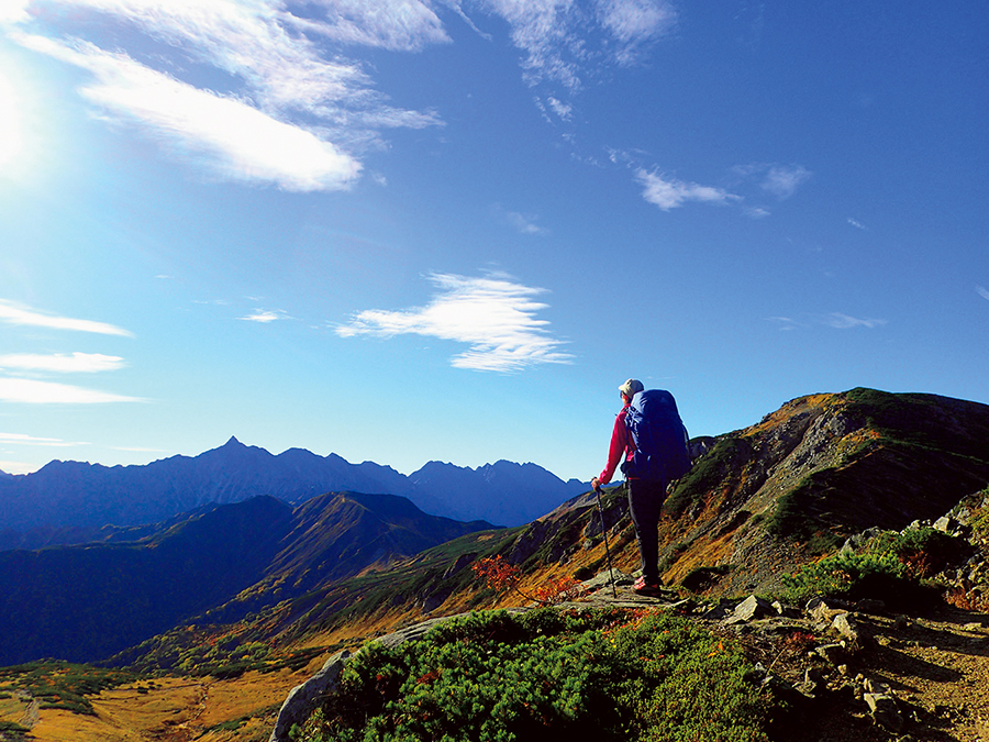 黒部川を挟んで見える対岸の雲ノ平の眺望もすばらしく、そのほか五郎のカールや、三俣蓮華から先の槍を眺めながらの稜線歩き、鏡平からの槍穂の眺望など……、次々に現れる景色がまったく飽きさせない極上のコースだと思います。しかも、ここに赤や黄色に染まる紅葉の色づきが加わるのだからため息がでないわけがありません。ムリせず3泊4日の行程でもよいですね。
