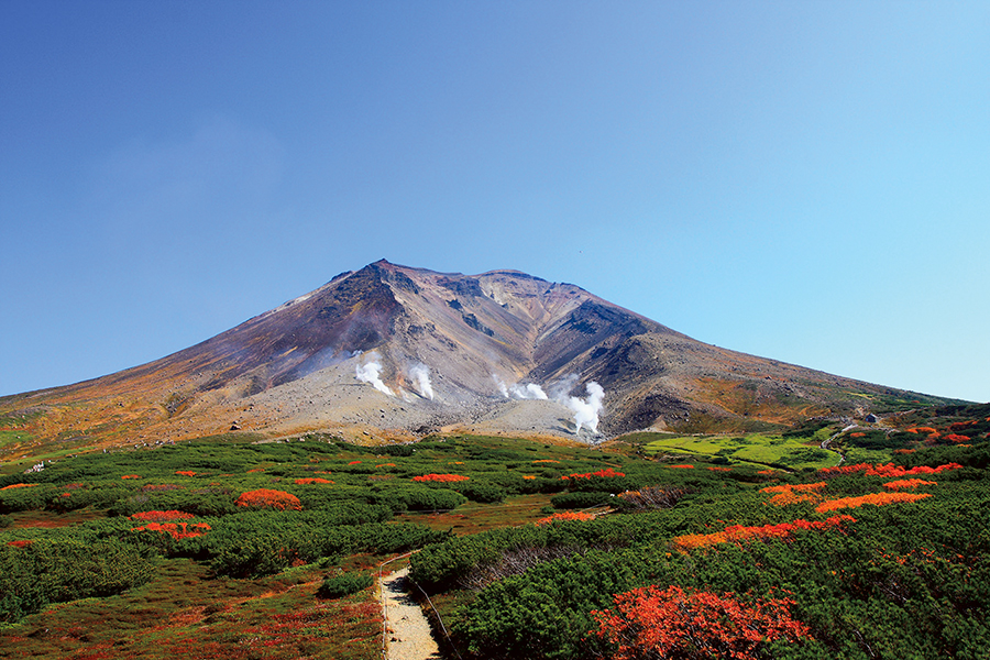 標高2,291m の旭岳は大雪山の盟主であり、北海道の最高峰。緯度と標高が高いことから秋の訪れが早く、8月末にはナナカマドやチングルマなどからひと足早く紅葉が始まり、山肌が色づいていきます。