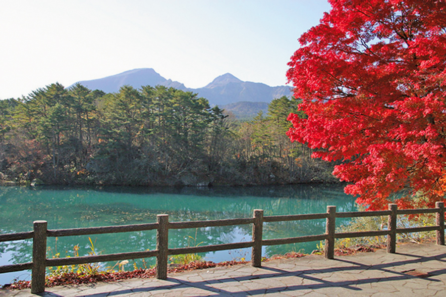 裏磐梯高原には大小の湖沼群が点在しているが、なかでも五色沼は一般観光客にも人気のスポットで、秋の風景はまさしく天下一品。光の具合によって色が変わる湖沼に、赤や朱、黄色……と秋ならではの木々の色合いが独特の世界観を創り出す。