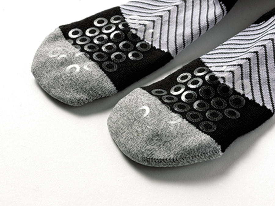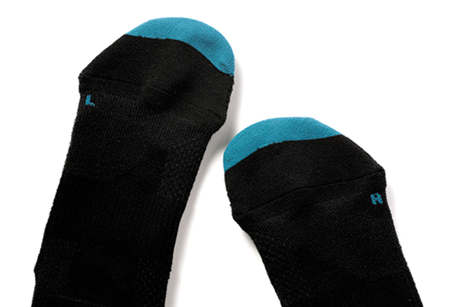 足裏に滑り止めを備える靴下はランニング向けモデルに多い。滑り止めがあることによって靴下が靴の中でズレることが軽減されるので、グリップ力が高くなるのだ。靴との一体感が高まるので、バランスも取りやすくなる。