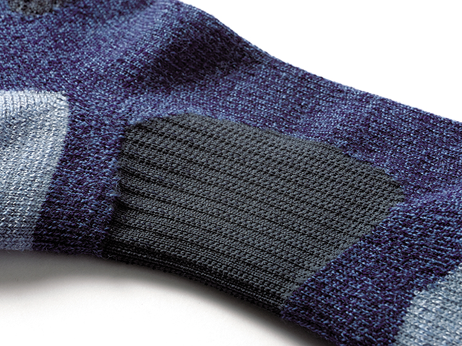 独自素材ウイックロンを使い、クッション性に優れた靴下。化学繊維は耐久性と吸汗速乾性に優れている。