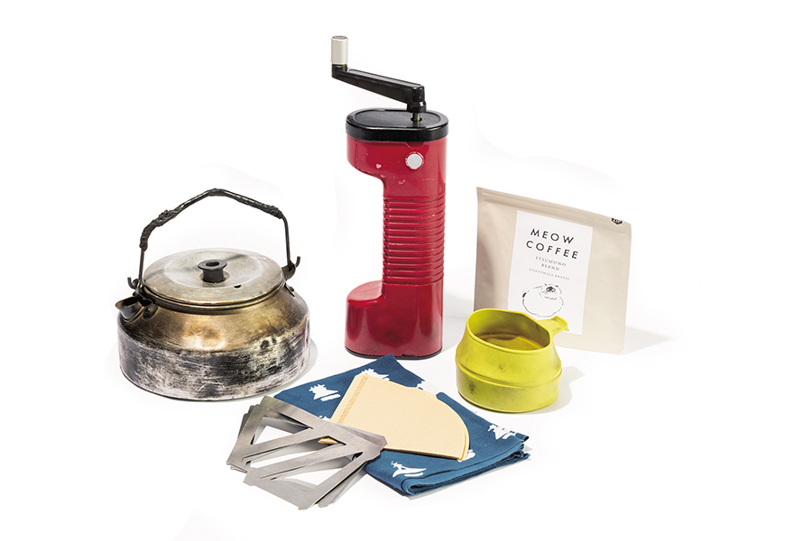 年季の入ったトランギアのヤカンは毎年のヒマラヤ旅でも活躍。カップとドリッパーは折りたたみ式。豆は那須で焙煎されたミャオコーヒーさんのイツモノブレンド。赤いミルは20代のころ住んでいた高円寺で見つけたもの。