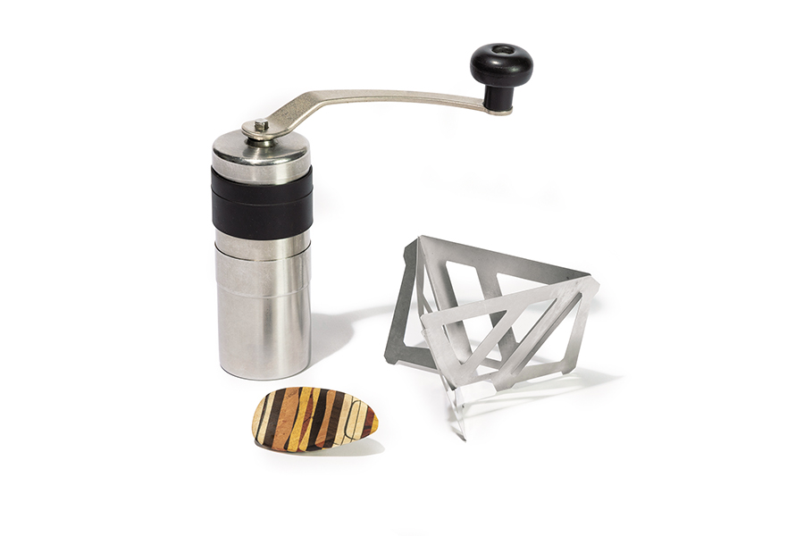 コーヒーは後片付けまで考えるとペーパーで淹れるのが一番。結局、これに落ち着いた。25gと超軽量で収納時は極薄。これ以上足し引きできない完成された佇まいが美しい。さじは組み木の切れ端を紙やすりで削ったもの。
