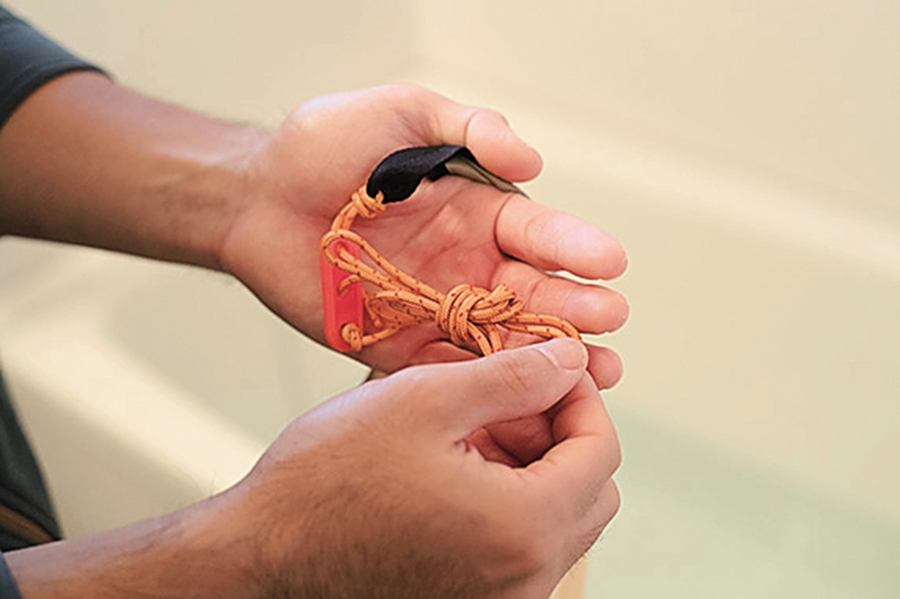 ちょうどいい場所にループなどがないときは、ゴルフボールなどを中に入れ細引きで吊るすという方法も。タープ設営時などにも使える裏技だ。
