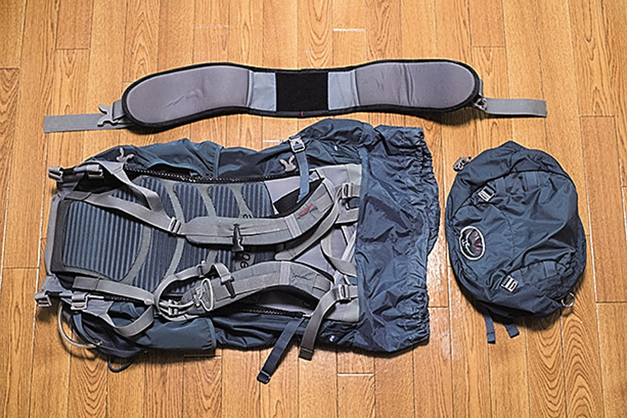 洗いやすいように雨蓋、ウエストハーネスなど取り外し可能なパーツはなるべく取り外しておく。洗ったあとに戻せなくならないように、取り付け方はしっかりと覚えておくこと。