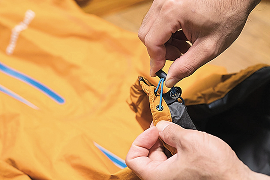 裾やフードのドローコードが締まっていたら緩めておく。シワになっていると汚れ落ちのムラにつながるためだ。収納式のフードなどは洗剤が溜まる原因となるので出しておく。