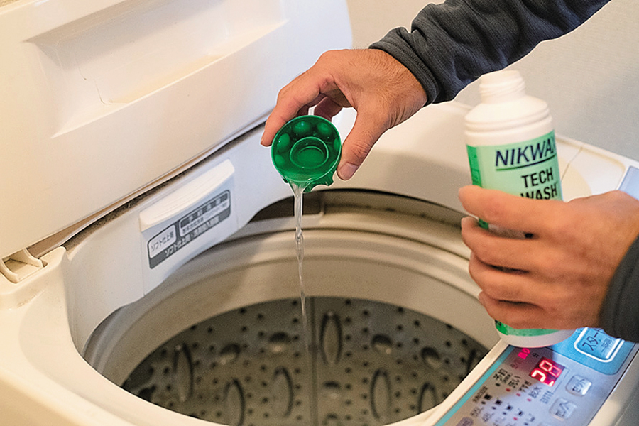 防水透湿生地用の洗剤を使用する。パッケージに適正な洗剤量の表示があるはずなので、よく確認して多くならないように注意して入れる。多すぎはすすぎ残しの原因になる。