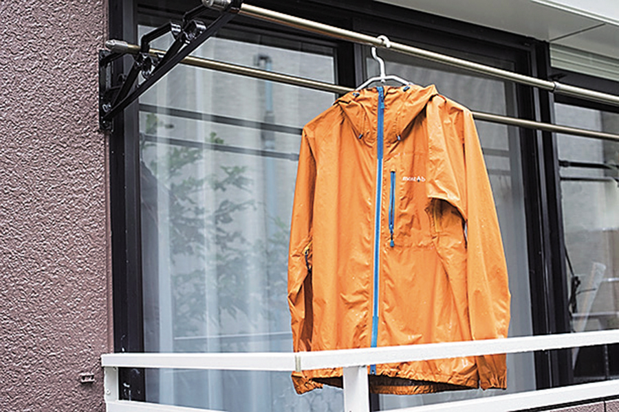 ベランダなど風通しのよいところで乾燥させる。紫外線は生地を傷めるので、直射日光が当たるところは避ける。途中でポケットやフードなどに水が溜まっていないか確認を。