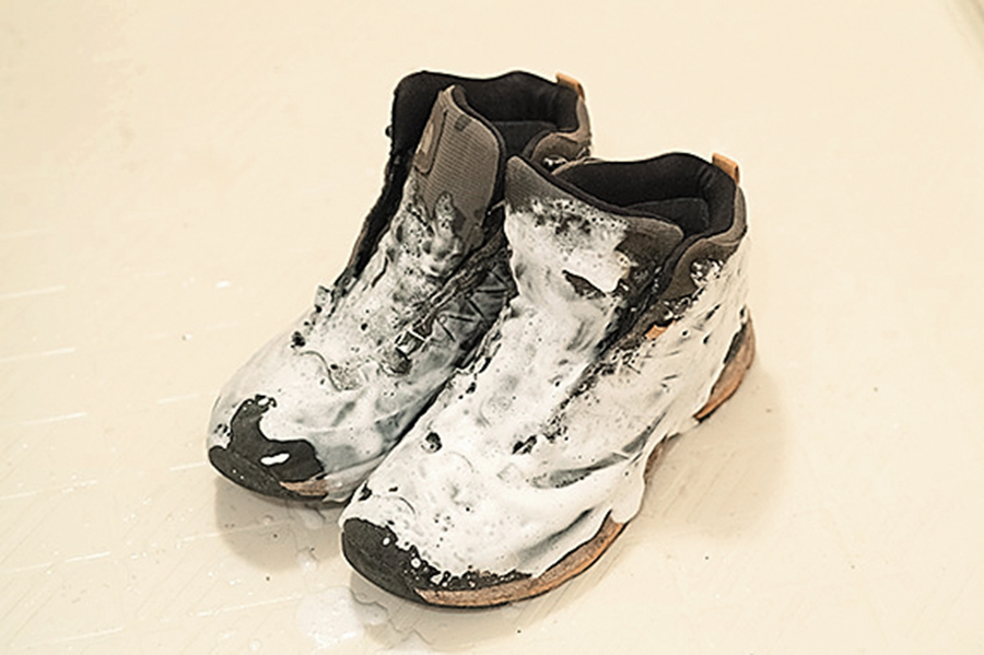 放置したあとは水で濡らしたブラシなどを使いクリーナーを落としていく。シューズの中に汚れた水が入らないように注意。