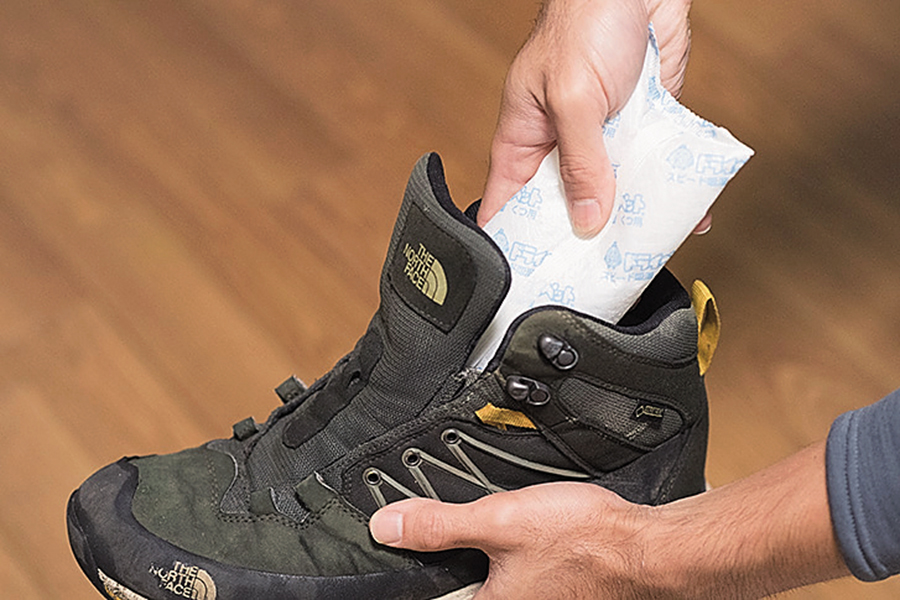 カビの原因になるので、保管時にはなるべく湿度が高くない場所で保管を。中に靴用の除湿剤などを入れておけば、カビが生えにくくなる。吉野さんは、下山して靴を脱いだときも湿気対策で除湿剤を入れている。