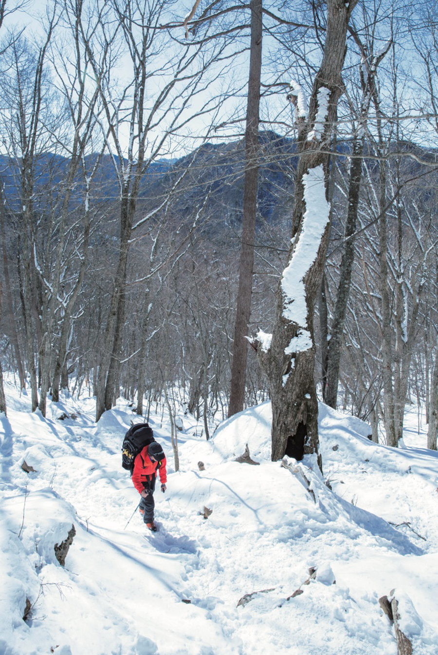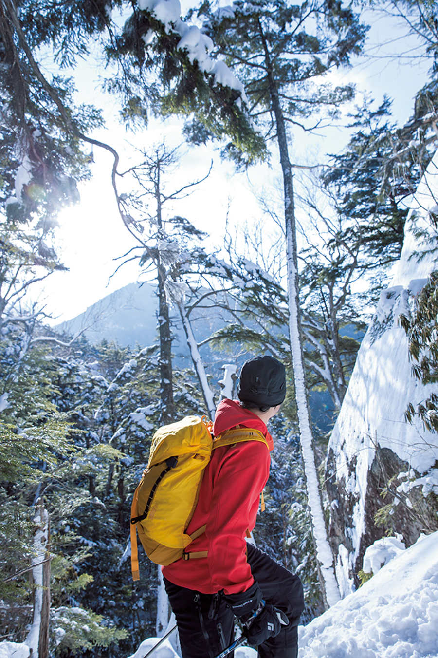 日が高くなるにつれ、気温は上 がっていく。といってもマイナス5°C程度だが、防風性が高いハードシェルジャケットは暑過ぎる。 僕は通気性が高いソフトシェルジ ャケットになって標高を稼いでいく。冬でも寒さを感じずに山を歩けるのはありがたい。