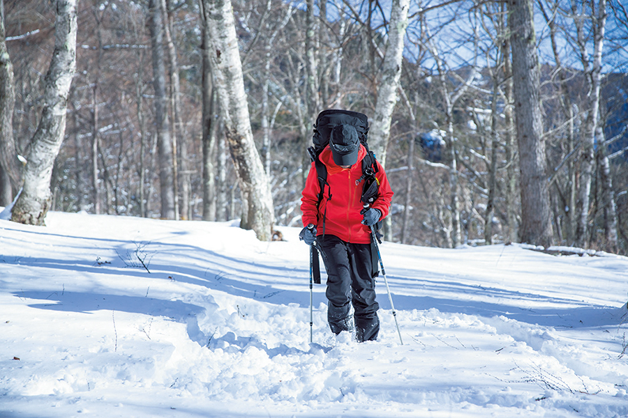 重要なのは、テント設営地のコンディションだ。体を横たえるスペースだけでもしっかりと雪を踏み固めて平らにならすことから、快適な一夜が始まる。周囲の樹木の葉が枯れ果てた雪山では、強風にさらされることも多く、ペグやアンカーで確実にテントを固定する技術も覚えたい。