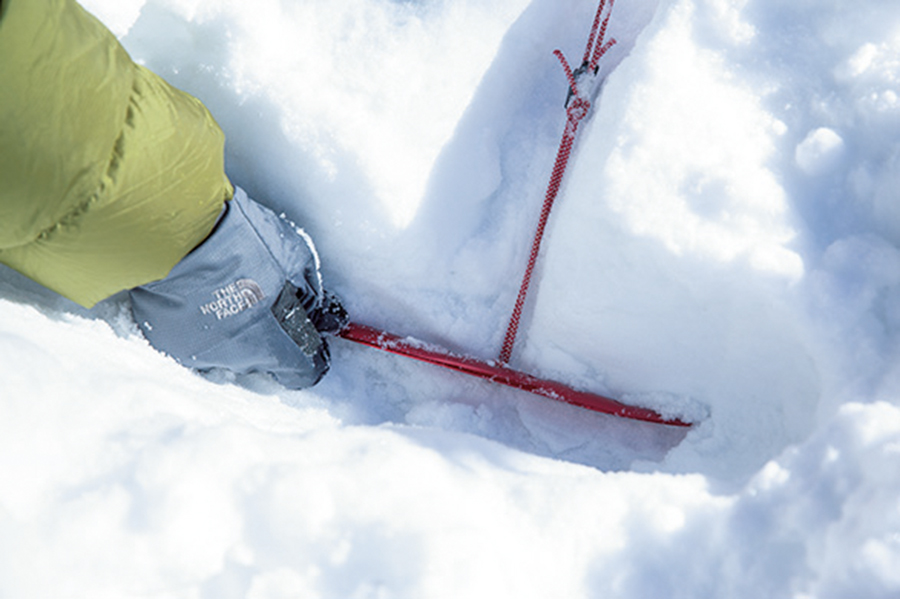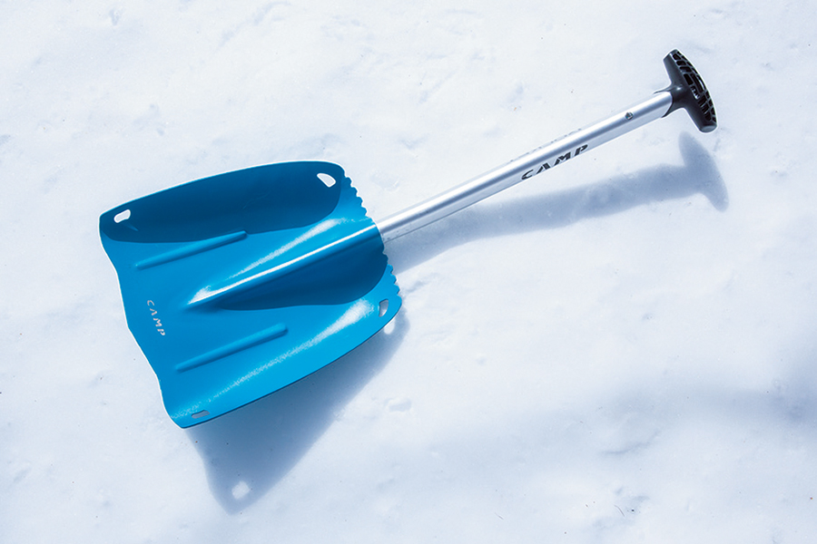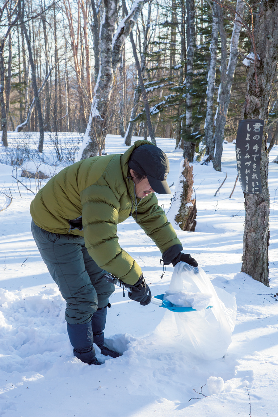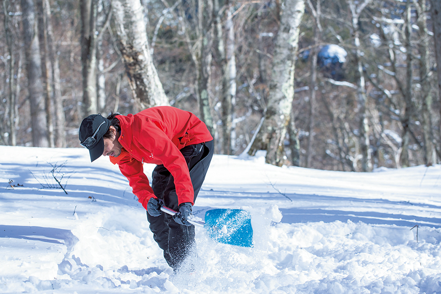 テントの前室部分は、使いやすい形状にショベルで雪を少し掘ると便利だ。雪が深ければ20~30cmほど掘り、そこにバーナーを置くと風の影響が少ない調理スペースに。積雪量が少ない場合でも10cm低くするだけでブーツの脱着が楽になる。雪山らしい工夫だ。