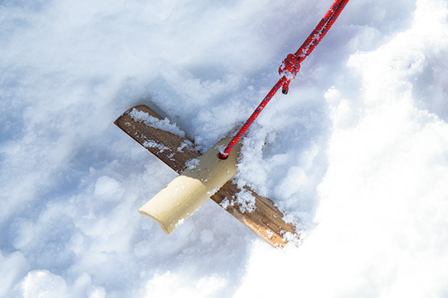 強風に対応するためにもテントは確実に固定しよう。無雪期用の一般的なペグも横倒しにして埋めれば使えないことはないが、形状が細くて雪中では安定しないので、雪山用のペグやアンカーを用意すると安心だ。雪と似た色で紛失しやすいシルバーよりも赤や黄色がよい。レジ袋もある程度は使える。