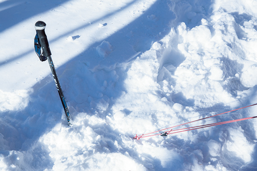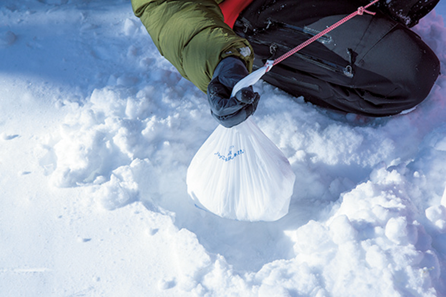 小さなものは雪のなかに埋もれると、二度と見つからない。面倒でも荷物は広げたウエアの上やシー トの上に置くクセをつける。付着した雪が溶けて荷物が濡れることを防止するのにも効果的だ。また、カラフルな袋を利用するとますます雪中で紛失する恐れが減る。
