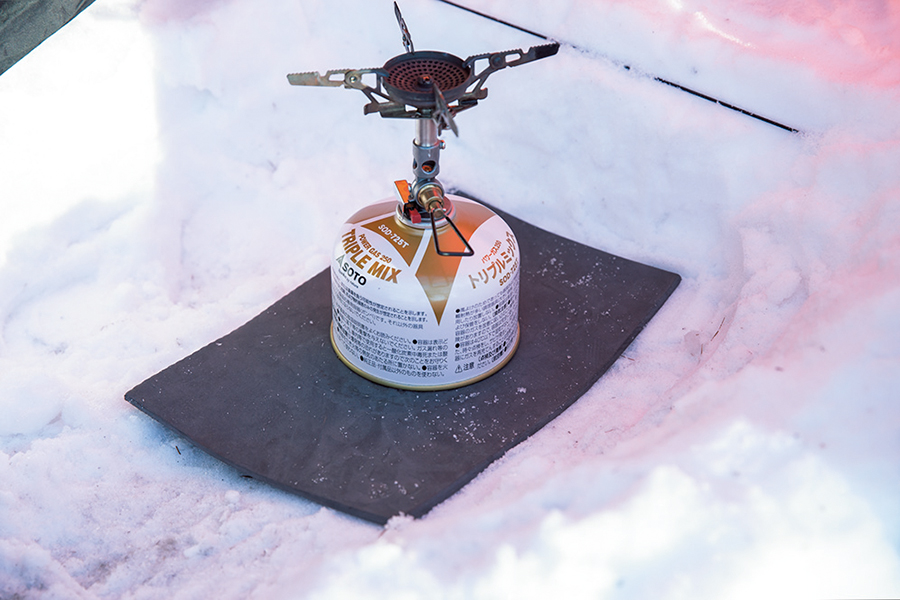 ガスカートリッジは低温に弱い。とくに使用時間が長いと冷却が進み、寒冷地用のガスであっても火力が低くなってしまう。これを避けるためには、カートリッジの下に敷く板などを持っていき、雪の冷気を遮断することだ。大きなクッカーを置いたときの安定性も上がり、調理がしやすくなる。