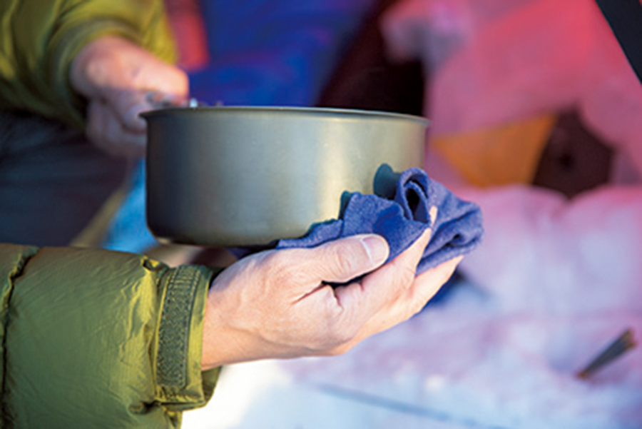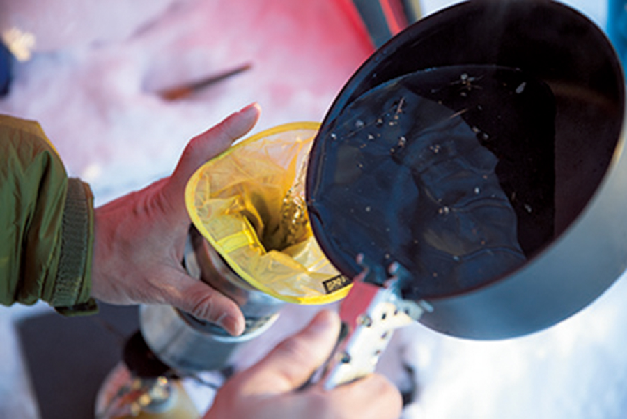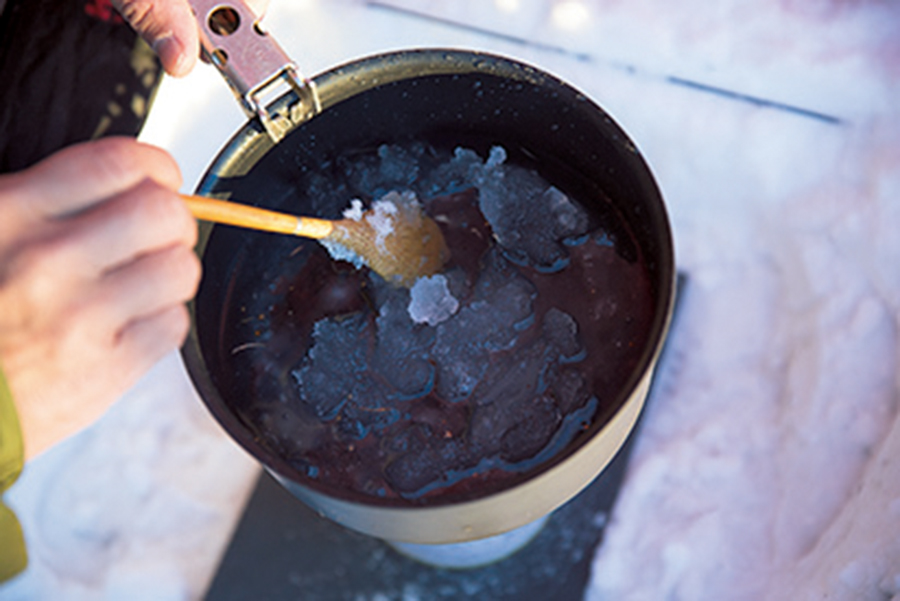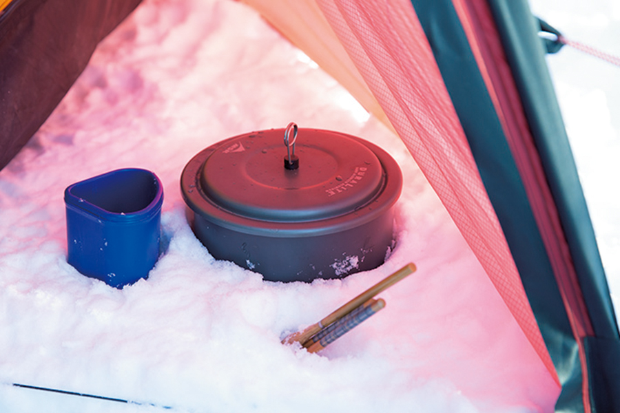 今回のテント場では冬でも水場が使えたが、通常の雪山ではバーナーで雪を溶かして水を作る。そのことも計算に入れて、燃料は多めに。クッカーには雪が溶けやすいようにはじめに水を少量入れ、それから火にかけていくと効率よく水ができる。フタはできるだけ外さないように。