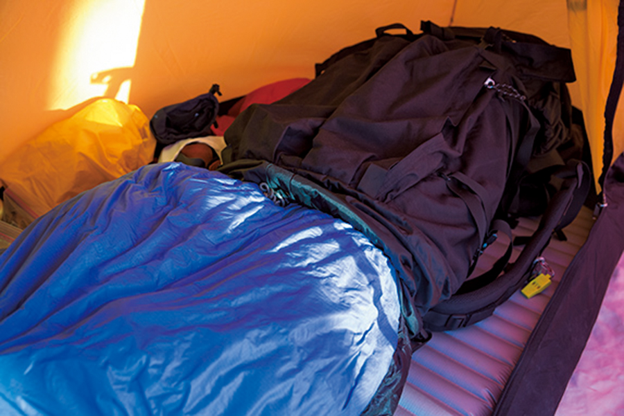 夜間にはテント内で結露した水分は凍りつき、テントに振動が加わると細かな氷として降ってくる。これがテント内の荷物を濡らす。濡らしたくないものはスタッフバッグに入れておこう。