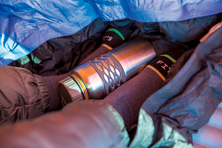 いかに自分の体温をウエアや寝袋内部から流出させず、外部の冷気を遮断するかが暖かく眠るときのポイント。シュラフのドローコードはしっかりと絞ってから眠りにつきたい。