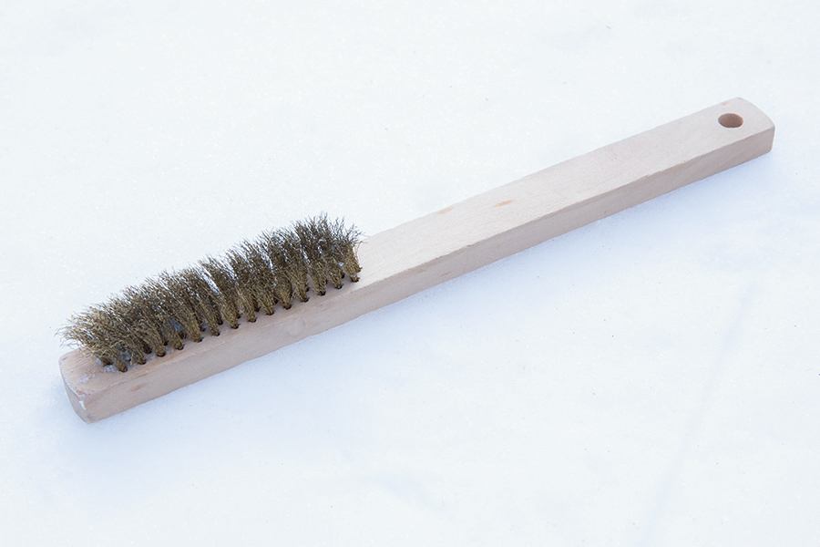 バックパックのパッド部分などには、細かな雪が付着する。そのままテント内に入れると体温で溶けてシュラフや着替えが濡れてしまうこと に。手で叩いてもそれなりには落とせるが、小さなブラシを持っていくと便利だ。ほうき代わりにテント内の雪を掃き出すこともできる。
