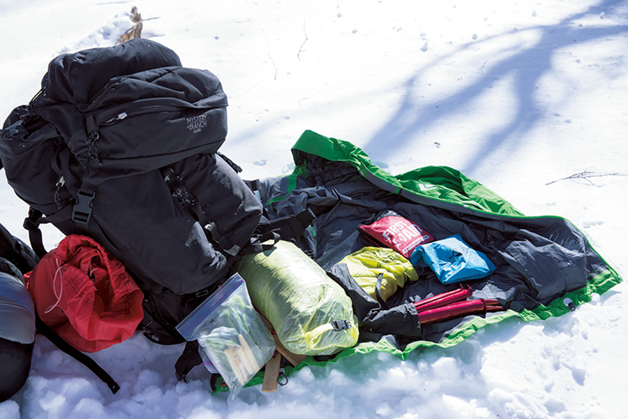 小さなものは雪のなかに埋もれると、二度と見つからない。面倒でも荷物は広げたウエアの上やシー トの上に置くクセをつける。付着した雪が溶けて荷物が濡れることを防止するのにも効果的だ。また、カラフルな袋を利用するとますます雪中で紛失する恐れが減る。