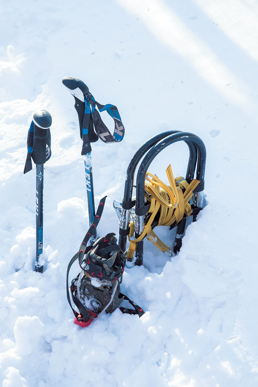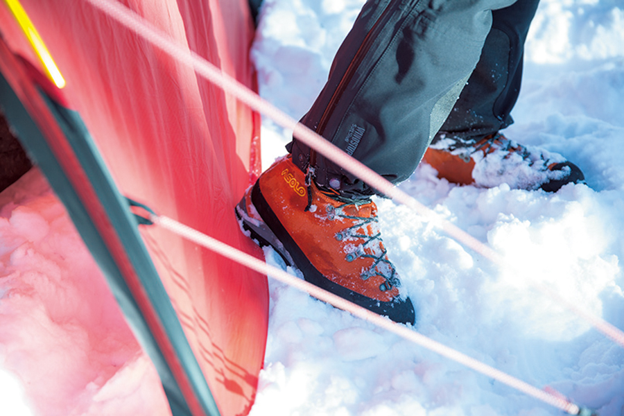 面倒だからとアイゼンをつけたままテント周りを行動するのは危険。気をつけていたつもりでも鋭い爪で破ってしまう失敗はよくあることだ。とくにテントの設営時には絶対に外そう。