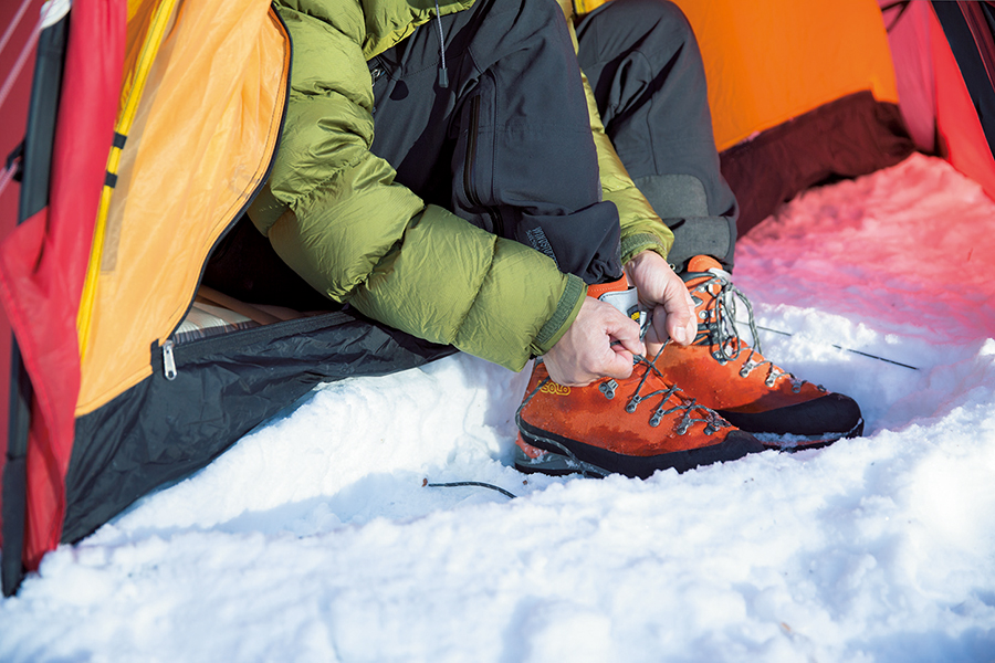 重要なのは、テント設営地のコンディションだ。体を横たえるスペースだけでもしっかりと雪を踏み固めて平らにならすことから、快適な一夜が始まる。周囲の樹木の葉が枯れ果てた雪山では、強風にさらされることも多く、ペグやアンカーで確実にテントを固定する技術も覚えたい。