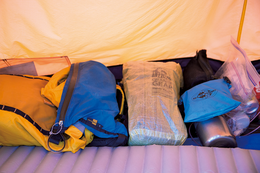 夜間にはテント内で結露した水分は凍りつき、テントに振動が加わると細かな氷として降ってくる。これがテント内の荷物を濡らす。濡らしたくないものはスタッフバッグに入れておこう。