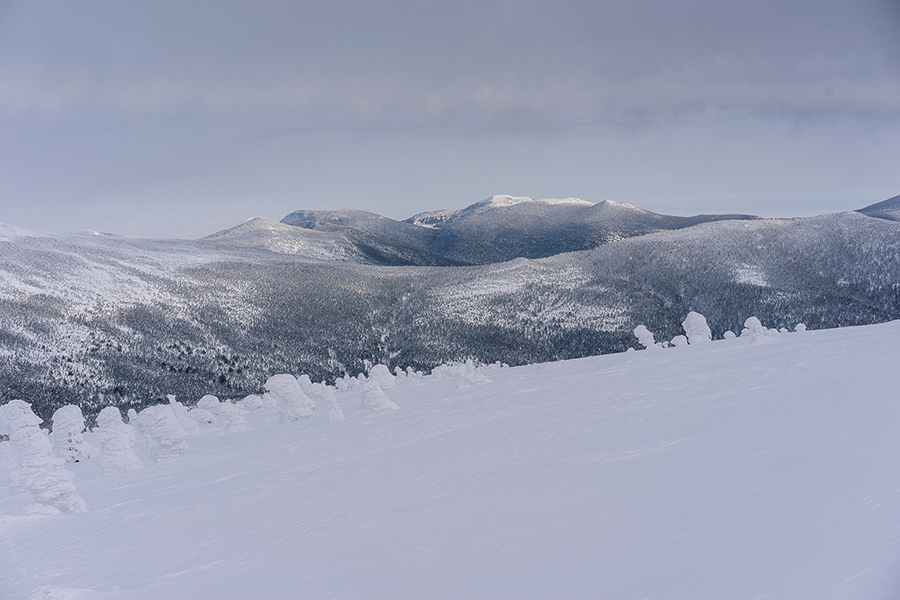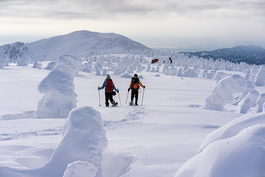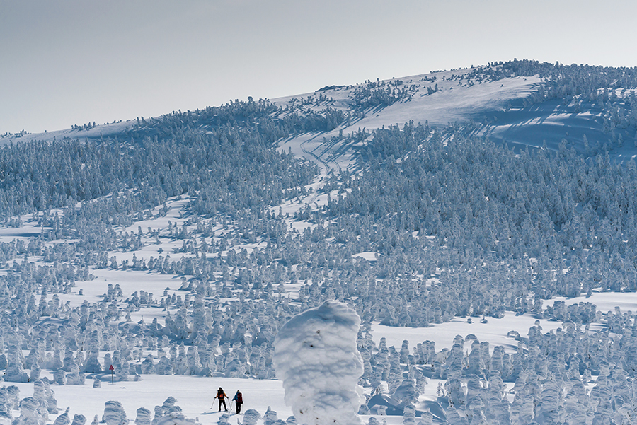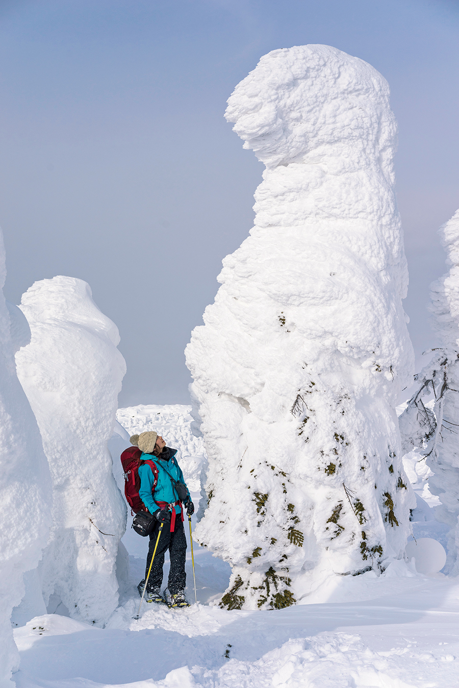 この常緑針葉樹に、雪雲の中の過冷却水滴が枝や葉っぱに着氷。その隙間に雪が取り込まれ、それが互いにくっついて固く締まることで、樹氷になるのだという。風や雪の状態によって、樹氷たちは複雑に変化し、ひとつとして同じものがない。だから、見ていて全然飽きないのだ。