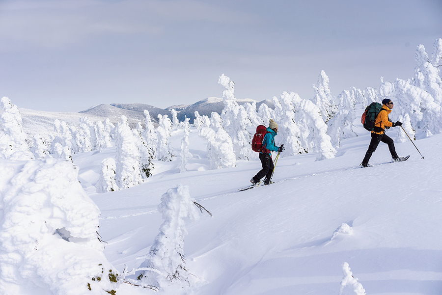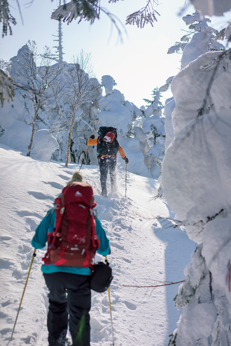 道標は少なめな ので、踏み跡がないときや視界が悪い場合は特に注意が必要だ。樹氷が形成されるのは1月上旬から3月中旬頃までだが、3月に入ると樹氷の質はやや落ちる。