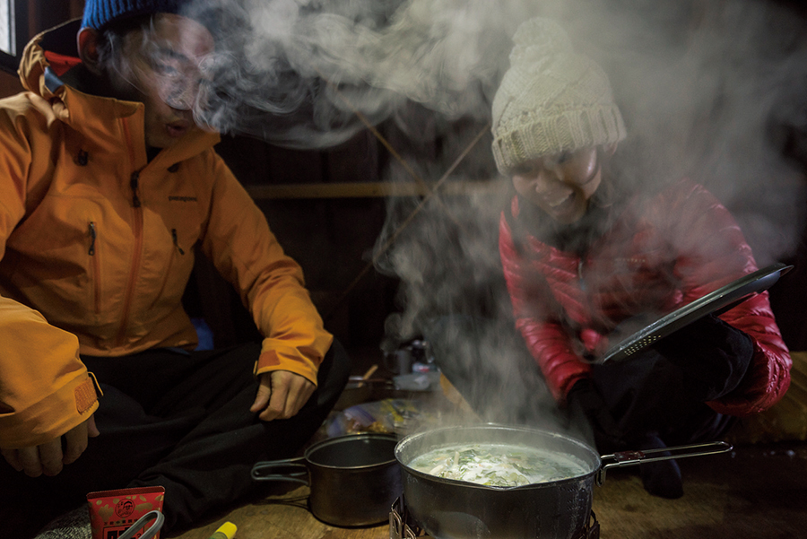 夏山登山では、傷むのが恐くて持ってこられないような食材を楽しめるのも冬山の魅力。この日は大量の蠣鍋を食べな がら、のんびり宴会である。海とはまったく無縁の山中で食べる魚介類は、とても贅沢だ。