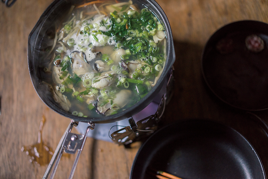 荷物を下ろして一休みしたら、ちょっと早めの夕食の準備だ。「今日は鍋を囲みましょう」と、池ちゃんがゴソゴソ取り出した食材のなかに、なんと大量の蠣があるではないか。