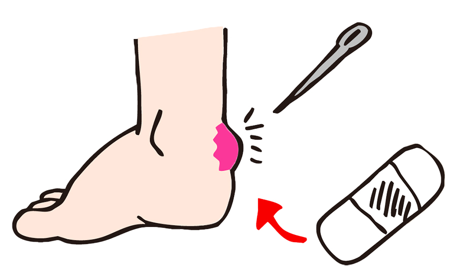 靴下を脱いで患部を乾かす。その後、殺菌した縫い針などで水泡の中の水分を抜き、患部に清潔なガーゼを当ててからテーピングで固定。靴擦れになる前に靴擦れ防止テープを貼ったりクリームを塗っておくのもいいでしょう。<斉藤勇一さん>