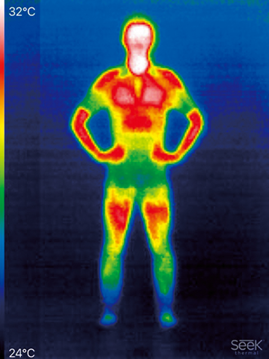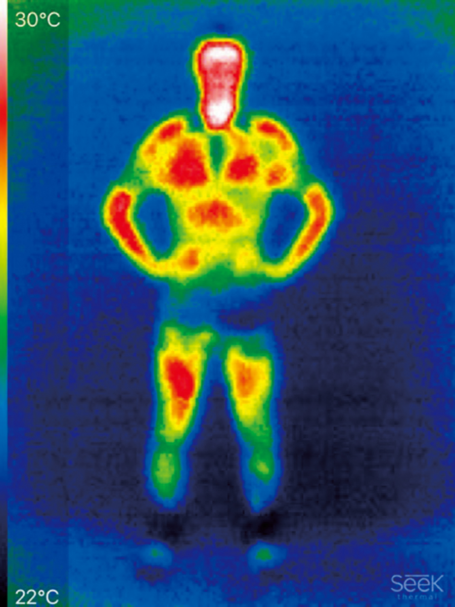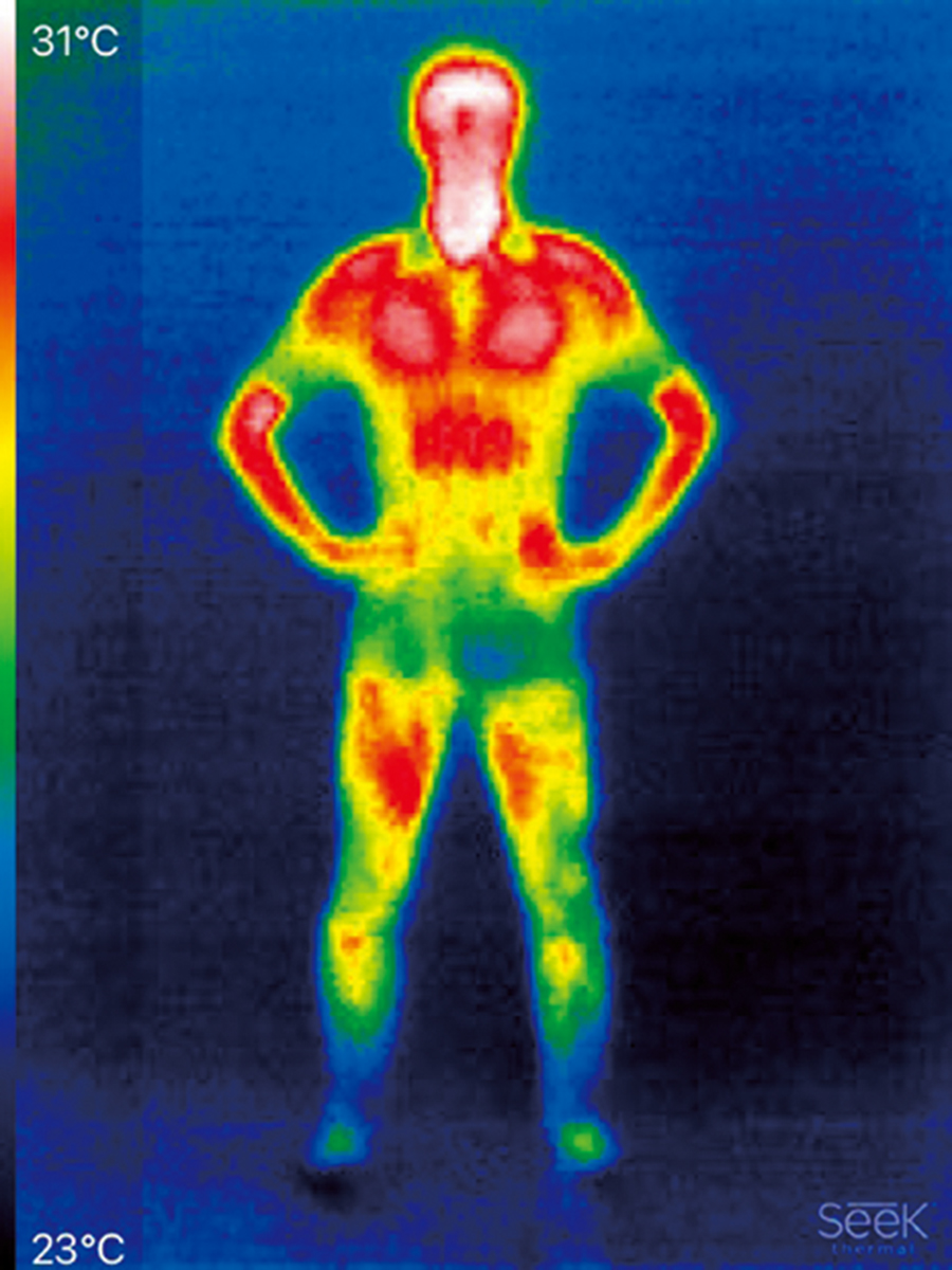 特別な運動をせずに道具を使って加温もしていない、ニュートラルな体温を撮影した。白い部分の体温がもっとも高く、左のグラデーションに沿って、白→赤→オレンジ→黄色→緑→青と温度が変わる。