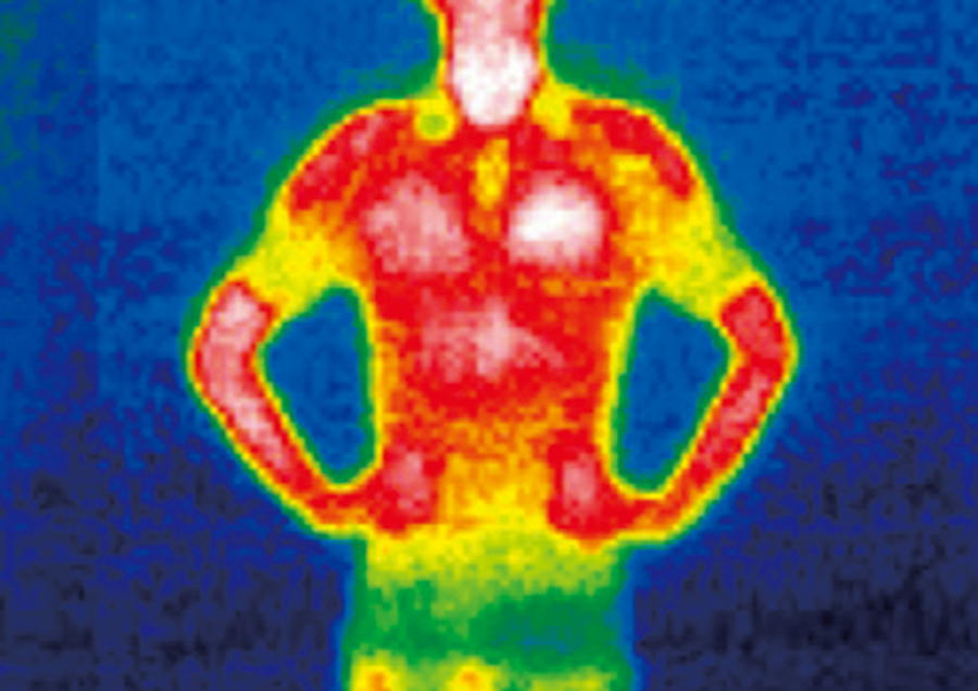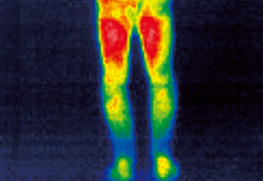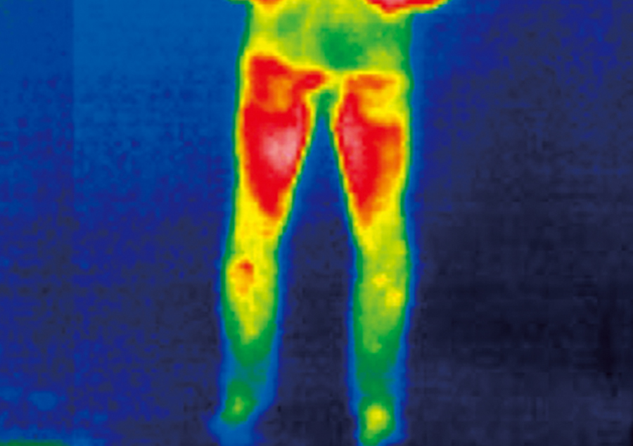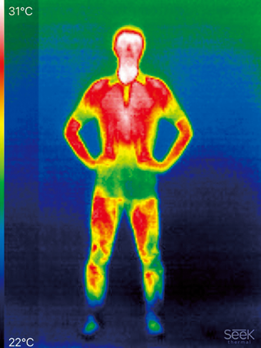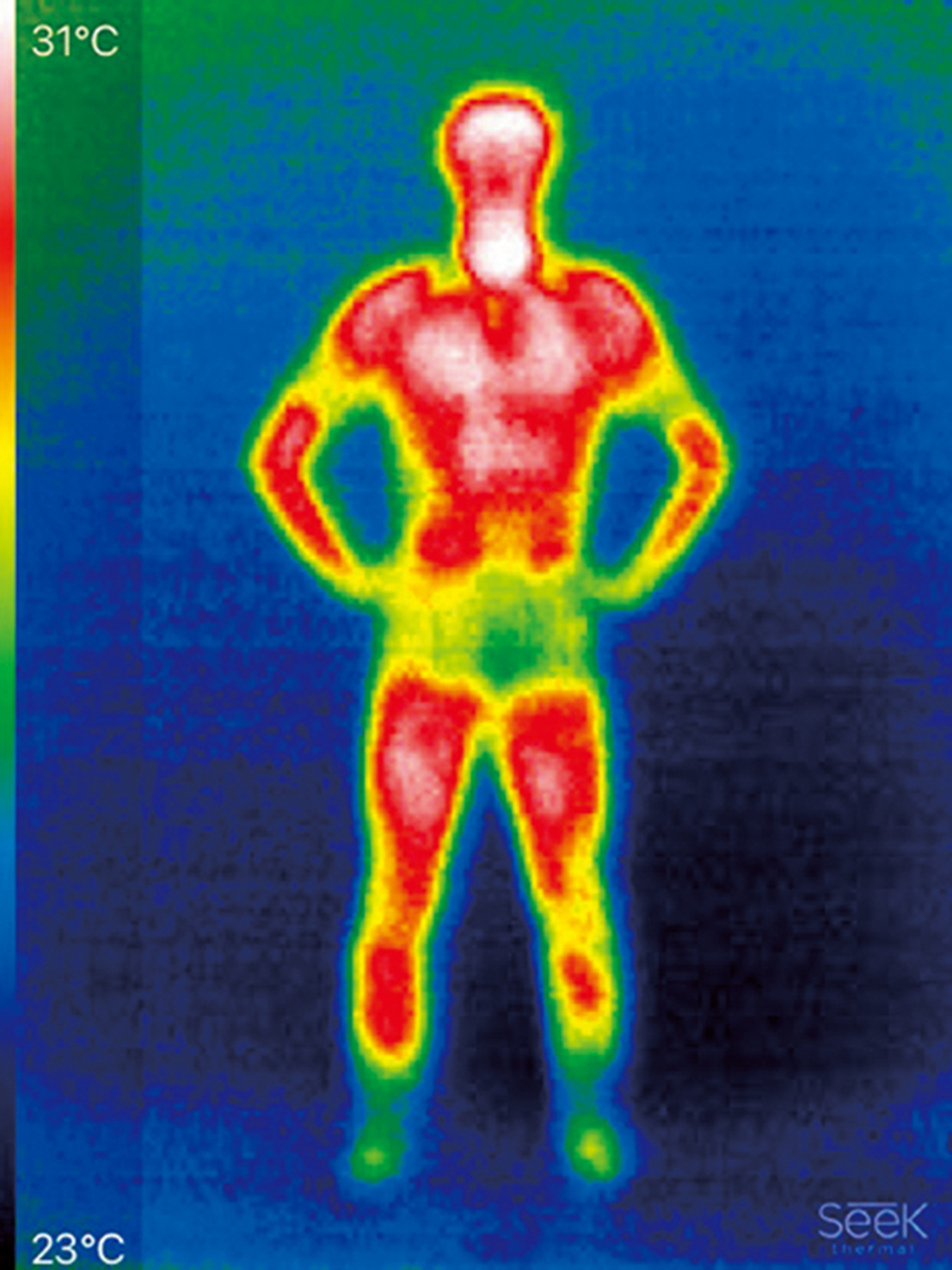 特別な運動をせずに道具を使って加温もしていない、ニュートラルな体温を撮影した。白い部分の体温がもっとも高く、左のグラデーションに沿って、白→赤→オレンジ→黄色→緑→青と温度が変わる。