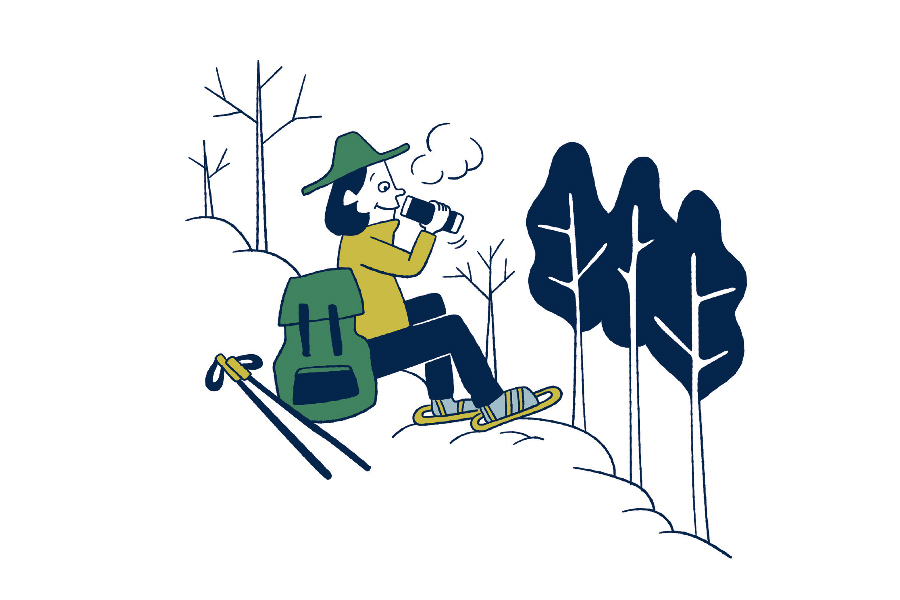 冬の冷たい風から登山者を守ってくれる樹林帯。休憩や食事で足を止める際は、その防風性がうれしい。深く雪の積もった閑静な森を進むと、幻想的な空間が広がり、北欧の山々を描いた物語のなかを冒険している気分にさせてくれる。