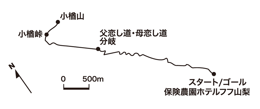 ルートは、保健農園ホテル・フフ山梨の北側駐車場を起点とした古くからある小楢山登山道。途中で母恋し道・父恋し道のふた手に分かれるポイントがある。