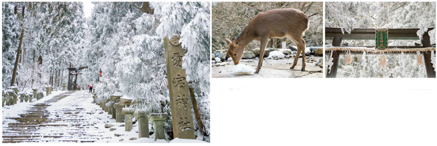 冬の山のキーンと冷えた空気と、雪化粧した社殿が佇む神聖な雰囲気は信仰の山ならでは。明智光秀が本能寺の変の前に参拝したというエピソードもあり、大河ドラマが絡む今年は注目が高まりそうな予感。