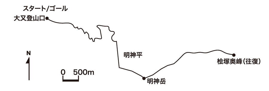大又林道終点から明神谷を詰め上がると、かつてスキー場があった明神平。広々とした気持ちのいい場所で、南側のピークが明神岳。ここから三重県側に張り出す支尾根を下って行くと、標高1,420mの桧塚奥峰がある。