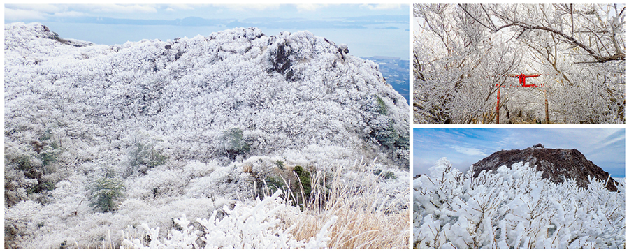 くじゅうの四季を色で表現すると「冬は白」。ここは、九州か? と思うほど寒くなり、条件が揃えば雪、霧氷が楽しめる。また、中岳直下の御池が凍った光景は、登った者だけが見ることができるご褒美だ。