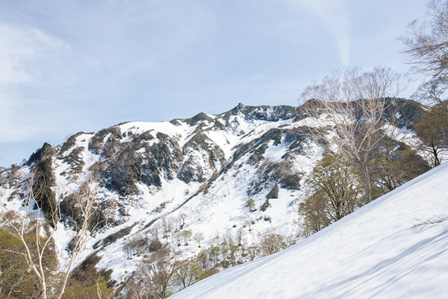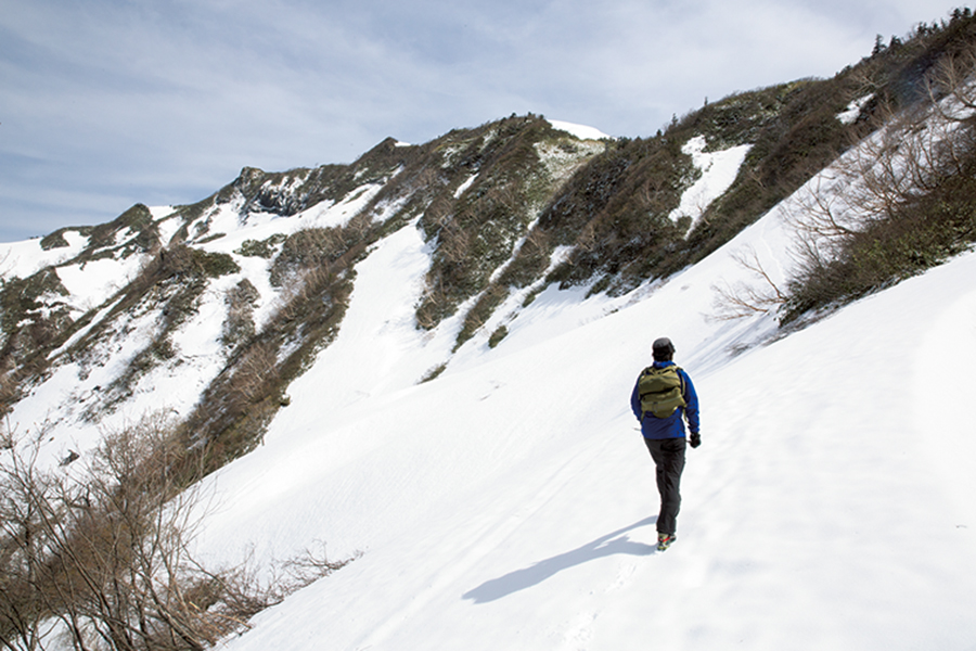 残雪を利用して山頂へ向かう方法にはいくつかあるが、今回はジライ谷近くの尾根を使うルートをセレクト。時間に余裕を持たせるために、稜線までテント泊装備を背負い上げて、1泊2日の行程とした。