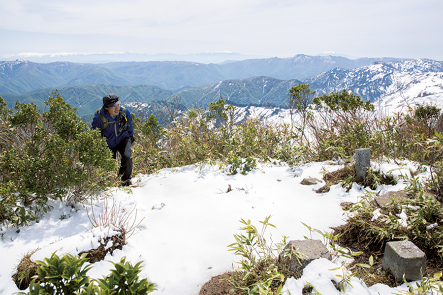 ⑨山頂は開け、眺望は抜群。白山はじめ、北アルプスなども眺められ、雪が多い時期にしか登れないのがもったいない。