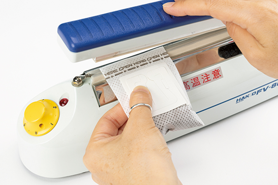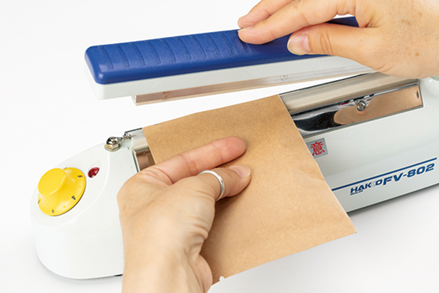 シーラーでペーパーの上部を閉じる。溶着時間はシーラーのモデルにもよるがこの厚さなら1秒ほど。