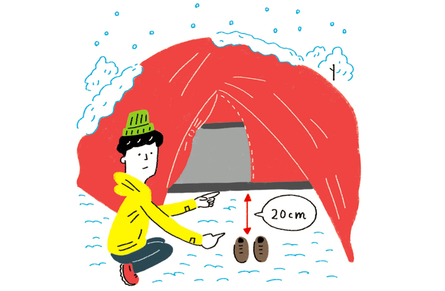 だから段を作るときは、入口の端から最低でも20 ~ 30㎝くらい離れたところからにしよう。そうしておくと着脱するときの靴の位置が自然にテントから離れるので、靴を脱いでテントの中に入る際、靴についた雪を中に入れてしまうリスクを減らすことにもつながる。
