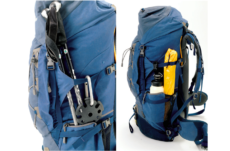 サンダルは袋に入れてバックパック内に収納し、ボトルでもせいぜいサイドポケットに収めたい。また、カップ類の外付けも汚れて不衛生なだけだ。引っかかりやすい大きなマットも取り付け方を工夫すれば、危険性は下げられる。